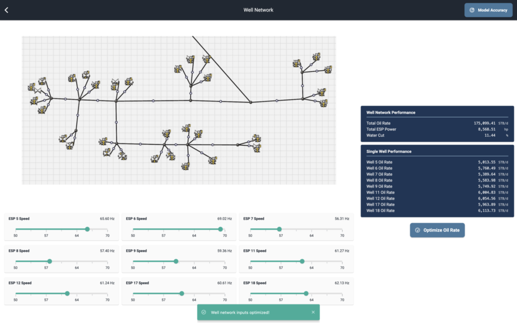 Geminus produces a model that matches the accuracy of the simulator with high inferencing speed. This model powers an intelligent advisor app that allows the user to virtually adjust power distribution to each pump in real-time and see the impact on oil flow. The app can optimize the entire network by scanning operating space and recommending the best setpoints for each ESP in just seconds.